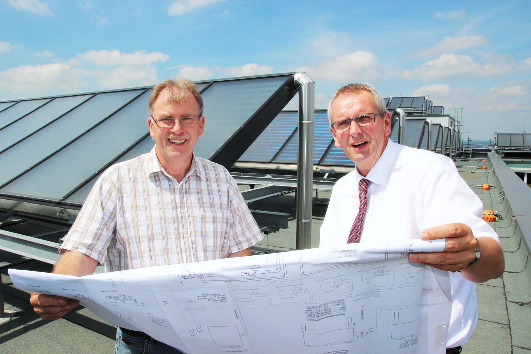 SOLID supported the responsible engineering team regarding the solar system size, possible applications, and most suitable solar thermal collectors. In total 4 roofs could be covered with solar thermal collector fields, which work together as one system.