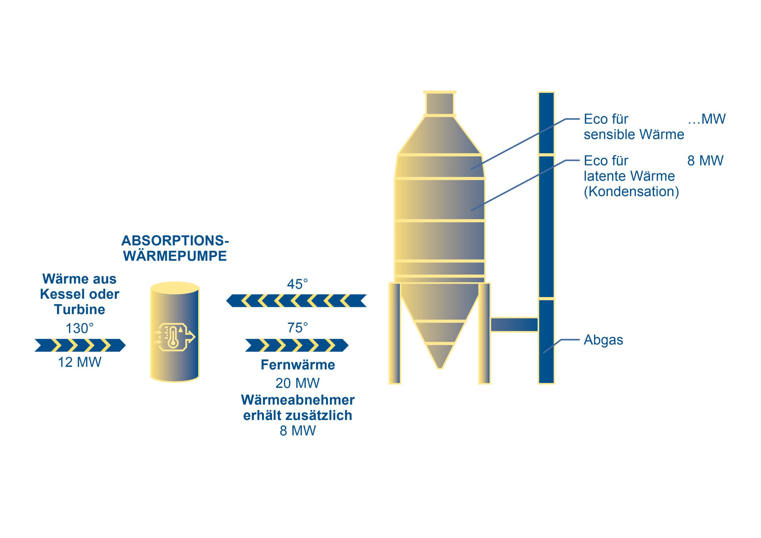 Um die Kondensationswärme von 45° C für die Fernwärme zu nutzen, wird eine thermisch angetriebene Absorptionswärmepumpe benötigt. Dadurch kann die Fernwärmetemperatur des Rücklaufs auf 75-85° C angehoben werden. Werden höhere Temperaturen zur Fernwärmeeinspeisung benötigt, kann der vorhandene Kessel die Temperatur auf das gewünschte Niveau anheben.